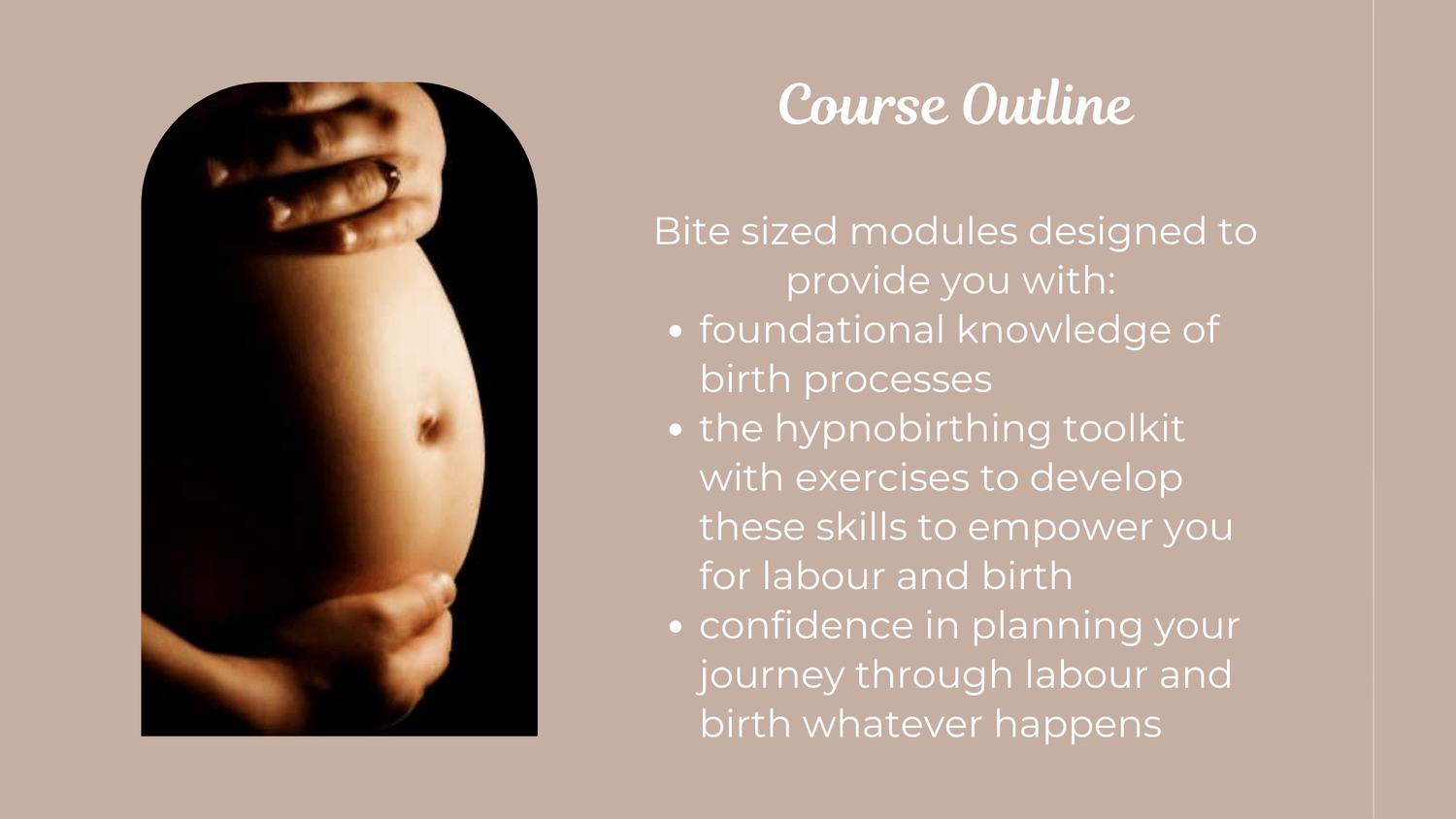 Each module guides you through the physical and emotional changes of pregnancy, the underlying birth processes, and their connection to maternity care in the UK. You will receive expert antenatal preparation, including hypnobirthing practice techniques before labour begins, alongside signposting to various practice options to help you build confidence in each tool.