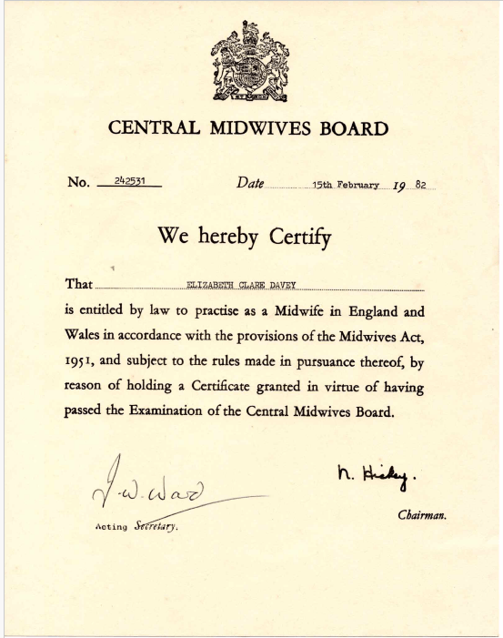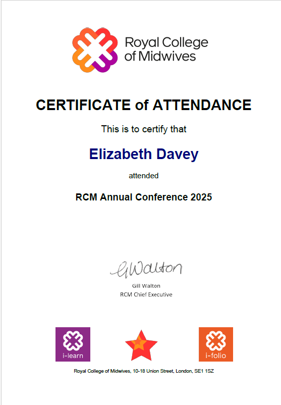 Registered Midwife (RM) including certification from NMC, and re-validated for inclusion on the NMC Register until 2027.